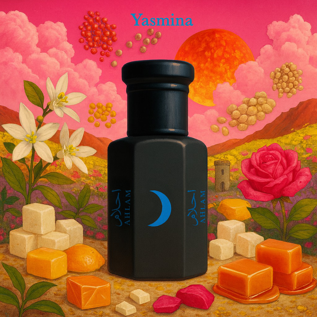 Yasmina opens with radiant neroli and bergamot, spiced by pink pepper and coriander, creating a bright and sensual entrance. Its heart blooms with orange blossom, honeysuckle, and jasmine, layered with delicate iris, rose, and a creamy hint of marshmallow — a floral symphony that feels both elegant and intimate. As the scent settles, warm vanilla, caramel, and sugar melt into musk, civet, and labdanum, leaving a trail that’s sweet, animalic, and irresistibly magnetic.